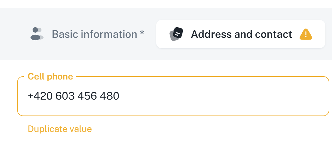 The field may contain a duplicate value, but a warning will be displayed. It is indicated by an orange exclamation mark.