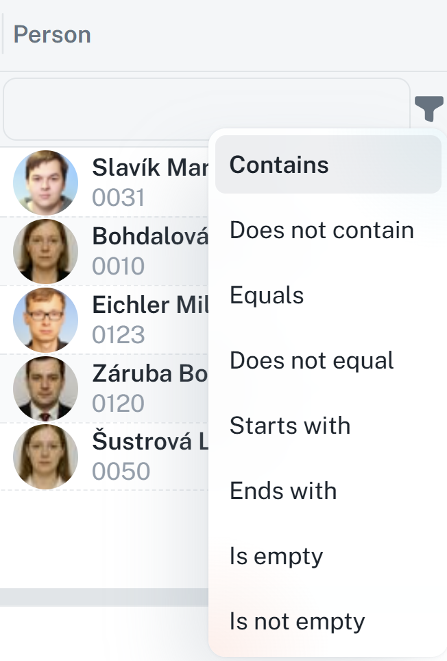 Filtering in the table can be activated by two ways - Either by the filter icon in the upper panel above the table, or directly in the context menu of a specific column.