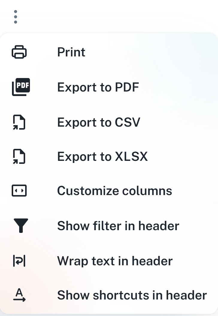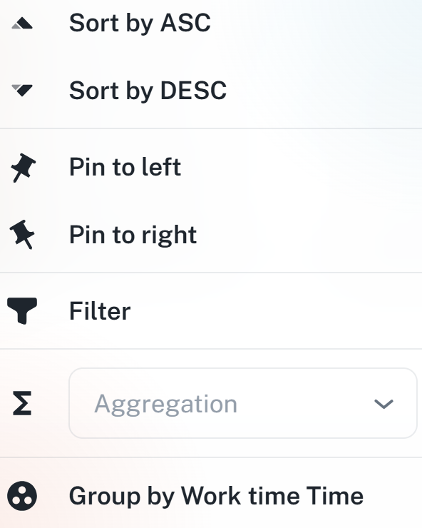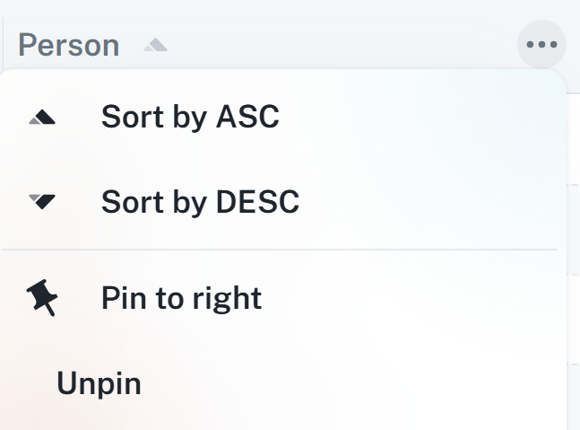 Every column in a table has its own context menu. You can open it by clicking the three dots next to the column name. The menu offers the following options: