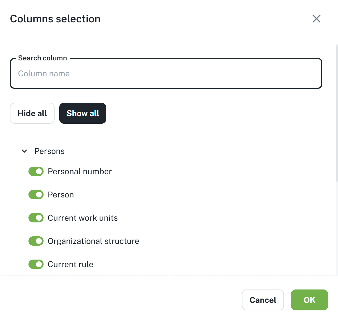 Displaying columns - After clicking the icon, a list of all available columns to show/hide will show up.