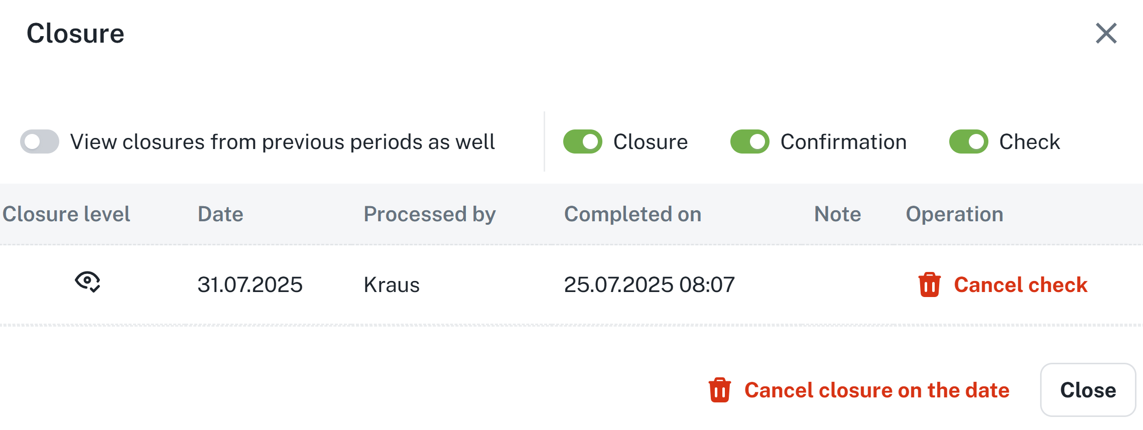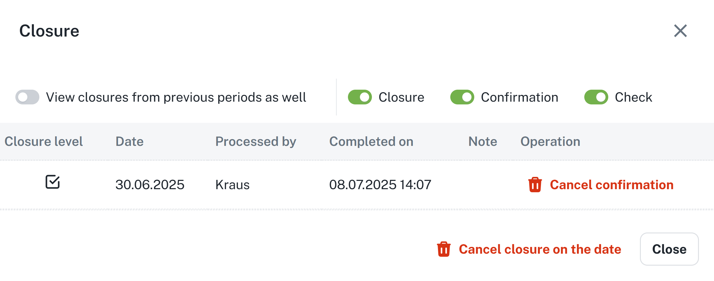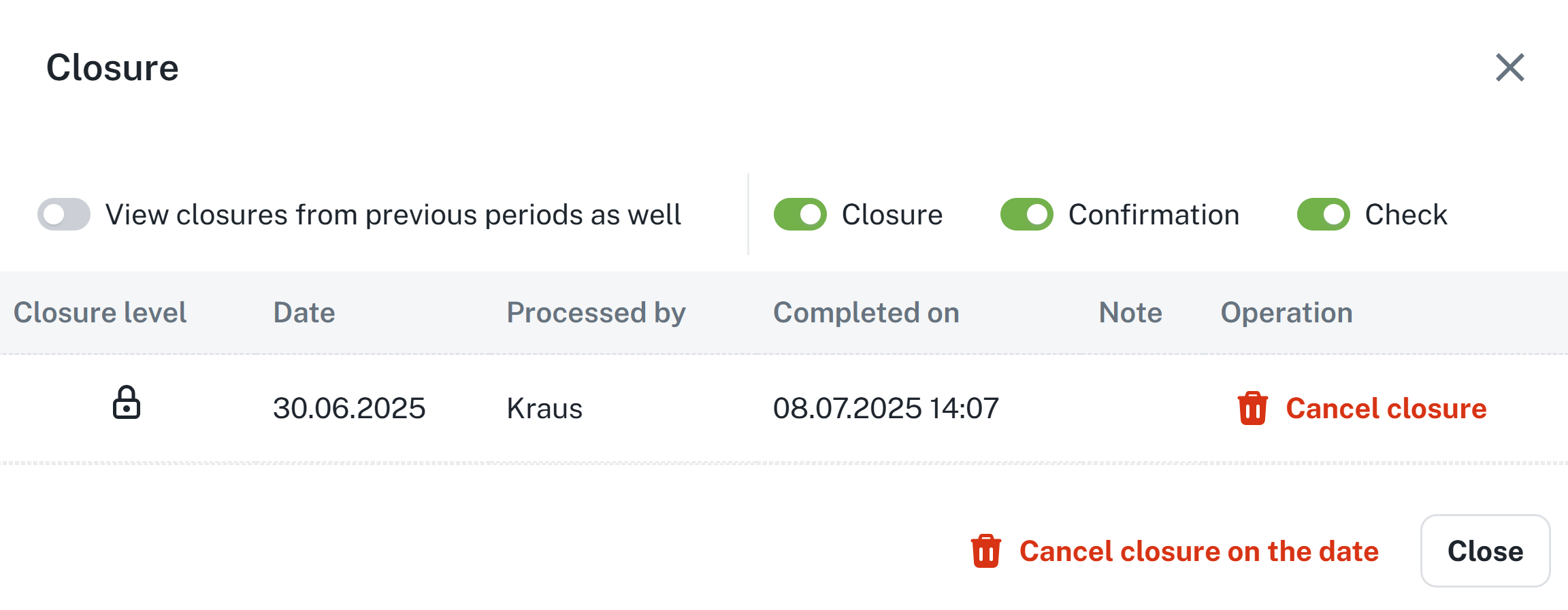 If you selected Period closure, review the displayed summary and click Close. If you selected Partial closure, the confirmation should be performed automatically.