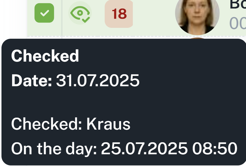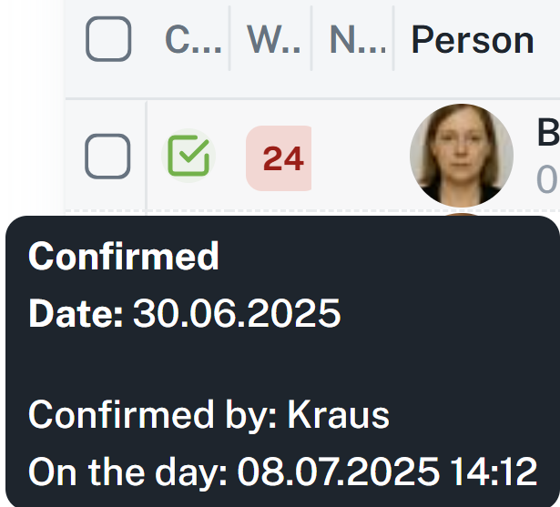After successful confirmation, you will see an icon in the Closing column for the person. When you hover your mouse over the icon, details will be displayed.