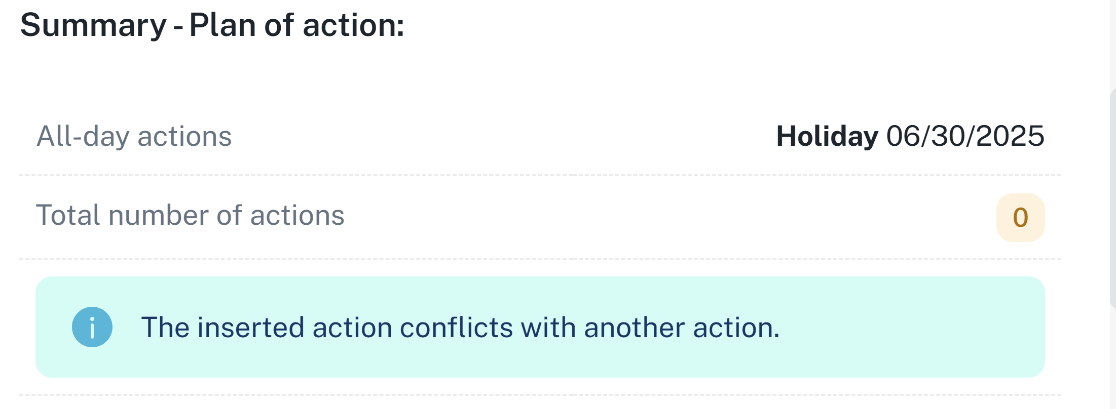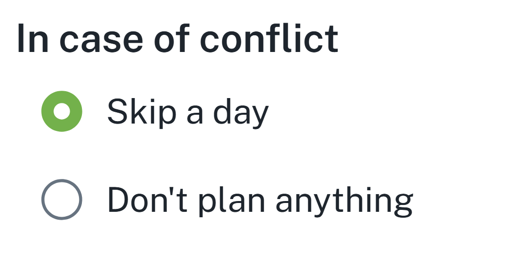 In case of a conflict with another event, e.g. when you have an action planned during the same day, the system will notify you and offer options to deal with the conflict — you can choose to Skip a day, or Not plan the event at all.