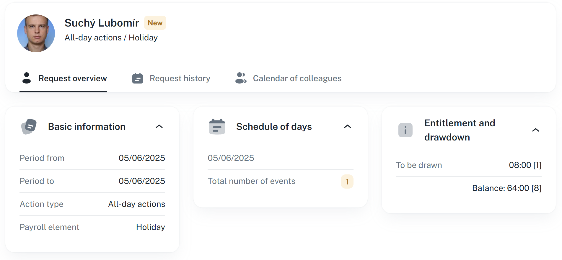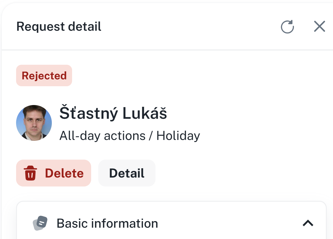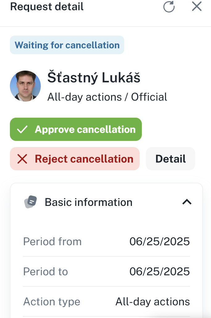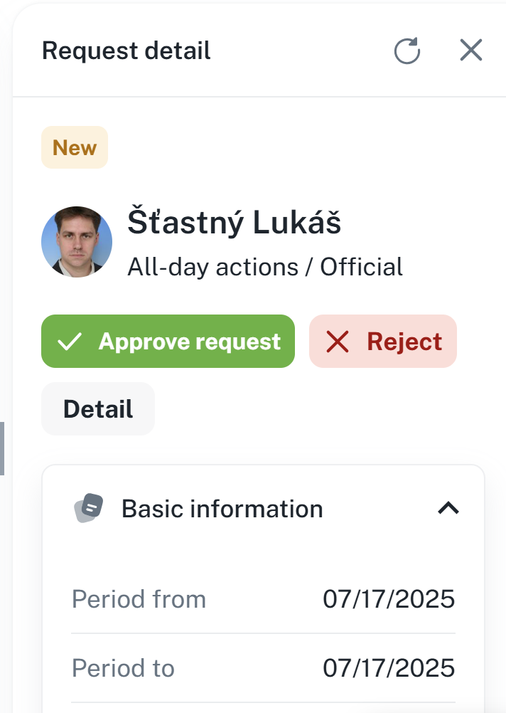 You can also process the request with a single click on a specific request. A side panel will open with the request details, where you will see the basic information, identical to the Detail window.