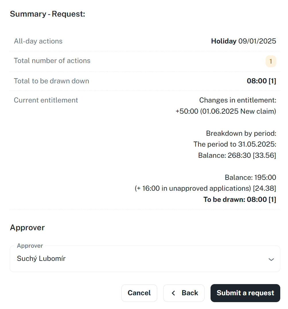 After clicking the Next button, a summary of your request with all information will be displayed. When utilizing the entitlement, an additional section Current Entitlement will be displayed, where you can see: