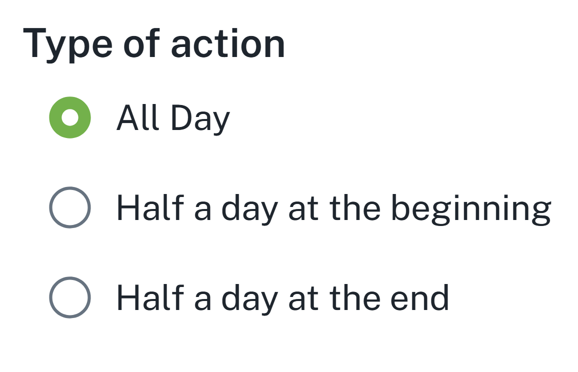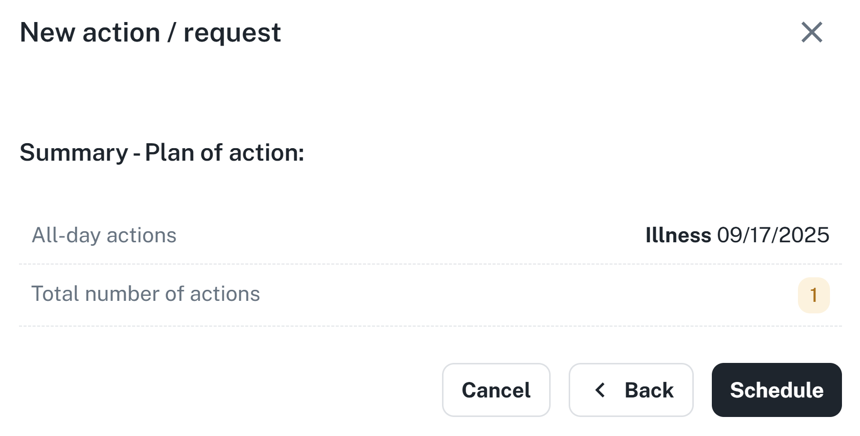 Actions are events that do not have to be approved by your superior, e.g. an illness, business trip or training. They can be added easily and are set immediately.