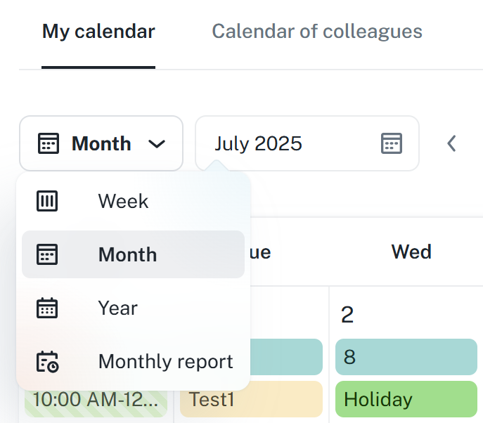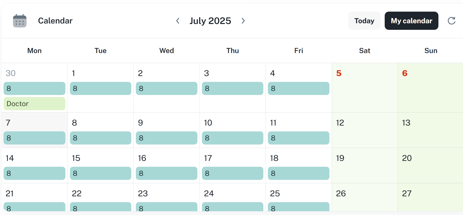 The calendar is your main tool for creating requests for leave and other work events. Thanks to it, you can easily see your planned hsifts, you can create vacation requests, report absence or plan business trips. Furthermore, you can check the calendar of your colleagues, to have an overview of their availability.