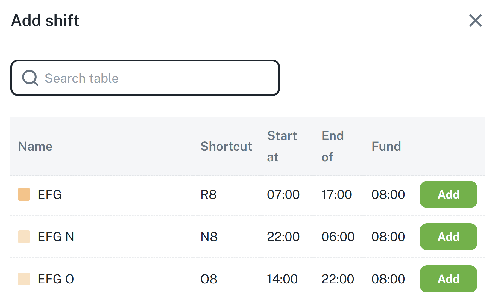 Add Shift - Opens a table with a filter for shifts that you can add. The filter applies to all columns.