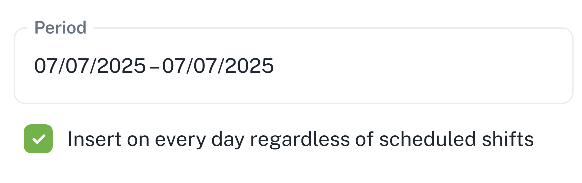 Warning: To plan an action, you have to have a planned shift for the chosen time period. If you do not have a planned shift, check the Insert on every day regardless of scheduled shifts checkbox.