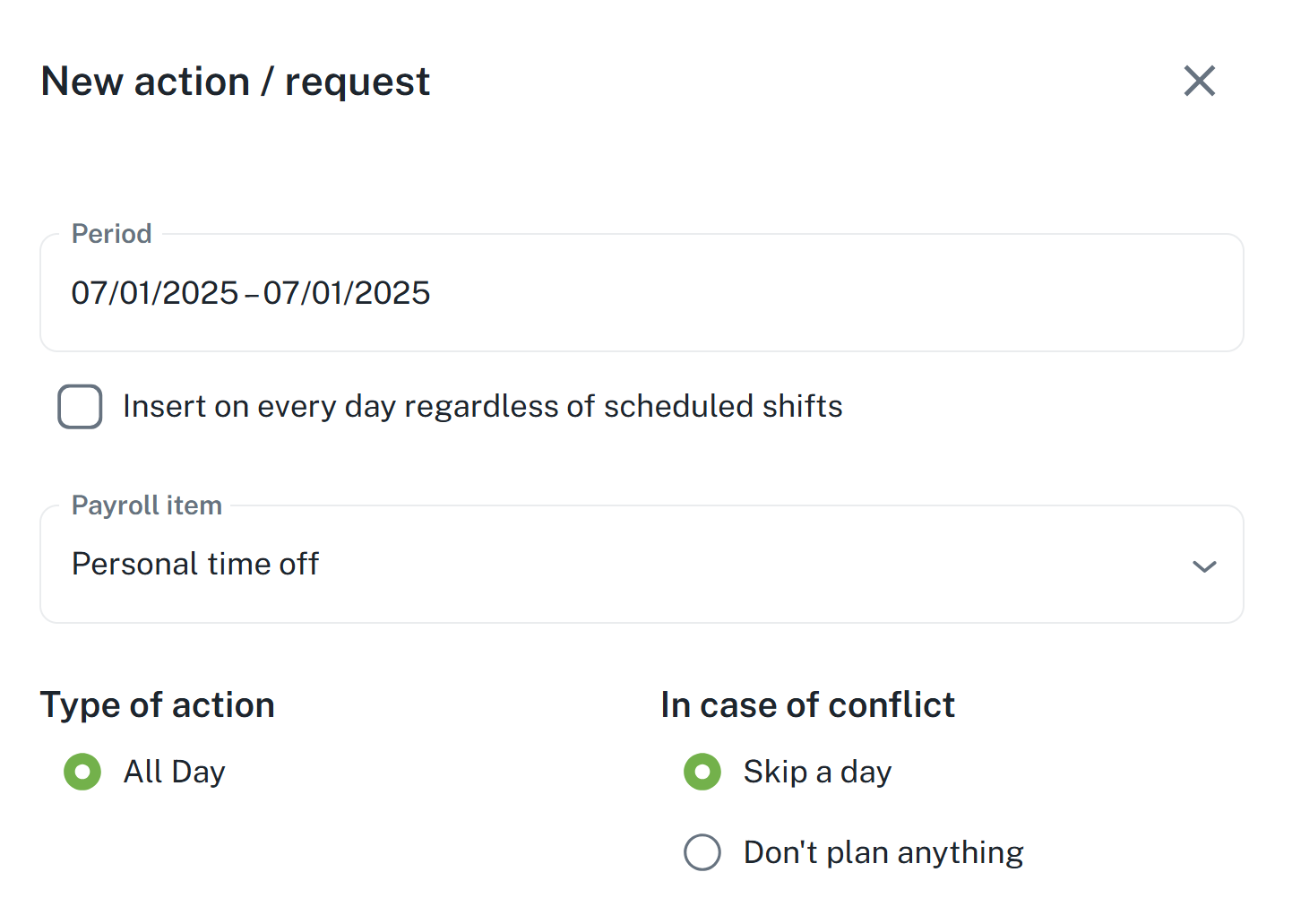 Schedule a new event – Opens the form to create a new event. Select the time period (automatically set by selecting the day/days), payroll item, event type, and option in case of a conflict. For more information about creating requests, please refer to the manual Requests: