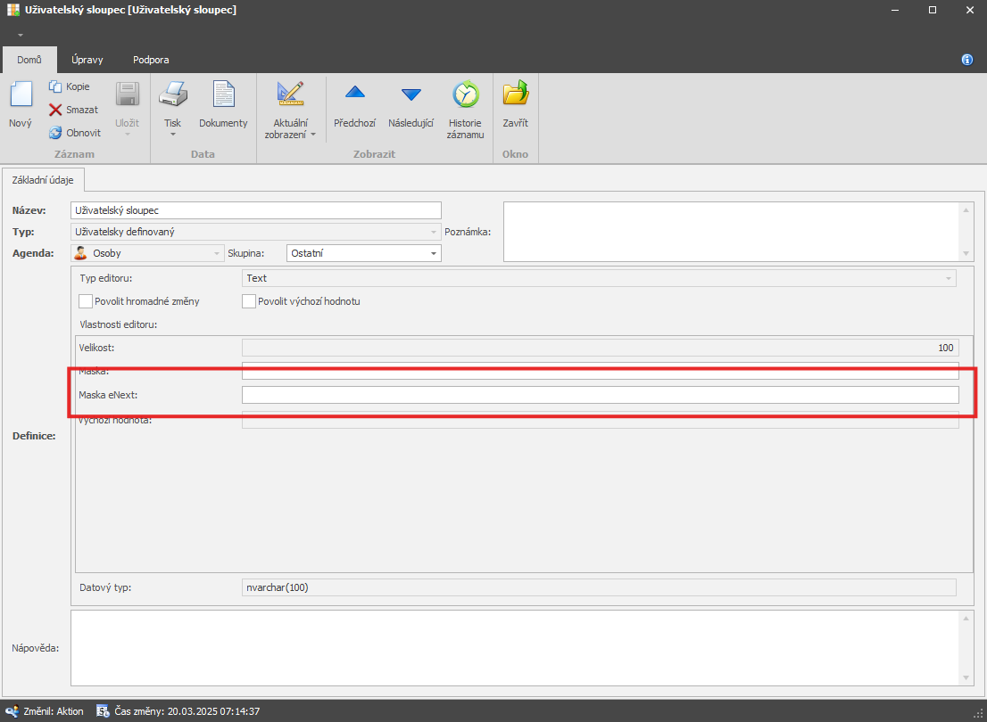 You can find the mask configuration in the detail of the user column, parameter “eNext Mask”. Enter the relevant character in the field according to the explanation below.